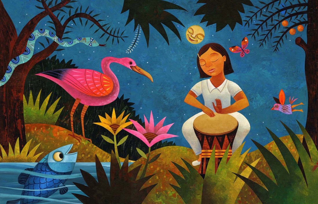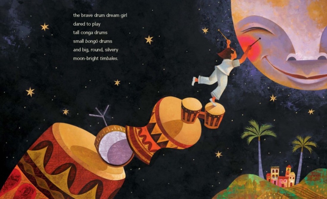 The vivid colors illustrated in this book perfectly complement the author’s word choices to eloquently describe the Island of Music and City of Drumbeats. The descriptive words provide enchanting imagery for readers to see the girl and all the drumming that surrounds her in this magical place.