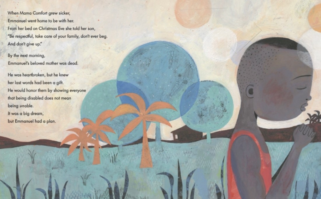 Emmanuel’s mother had great faith and was always encouraging her son to follow his dreams. Eventually the time came that Mama was too ill to care for Emmanuel and his siblings, so Emmanuel left to go to the city where he could work and earn money. Finding work was not easy as many people did not believe that Emmanuel was capable of working due to his disability. He was told by many people to go beg like other disabled people. This insulted Emmanuel who continued to follow his mother’s instructions to “Be respectful, take care of your family, don’t ever beg. And don’t give up.”